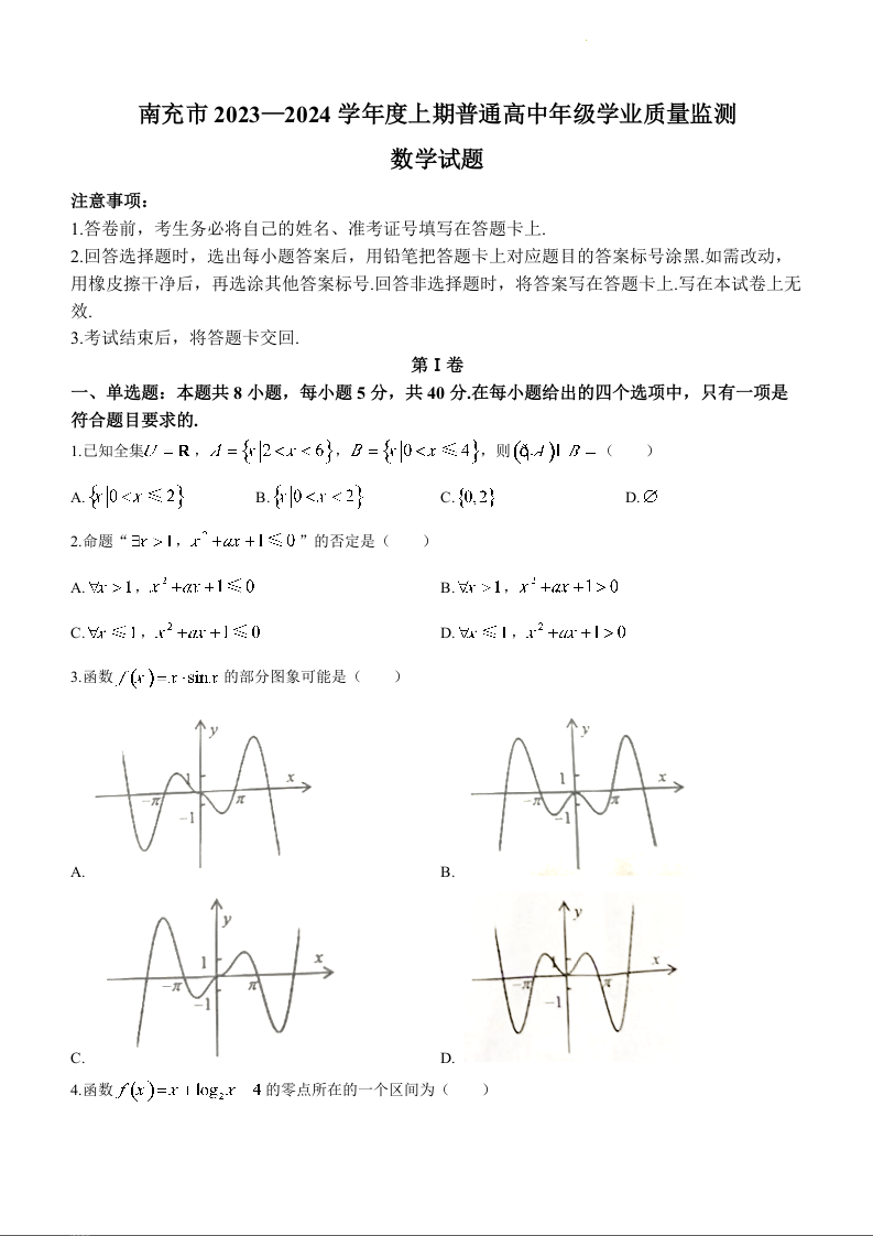 四川省南充市2023-2024学年高一上学期期末学业质量监测数学
