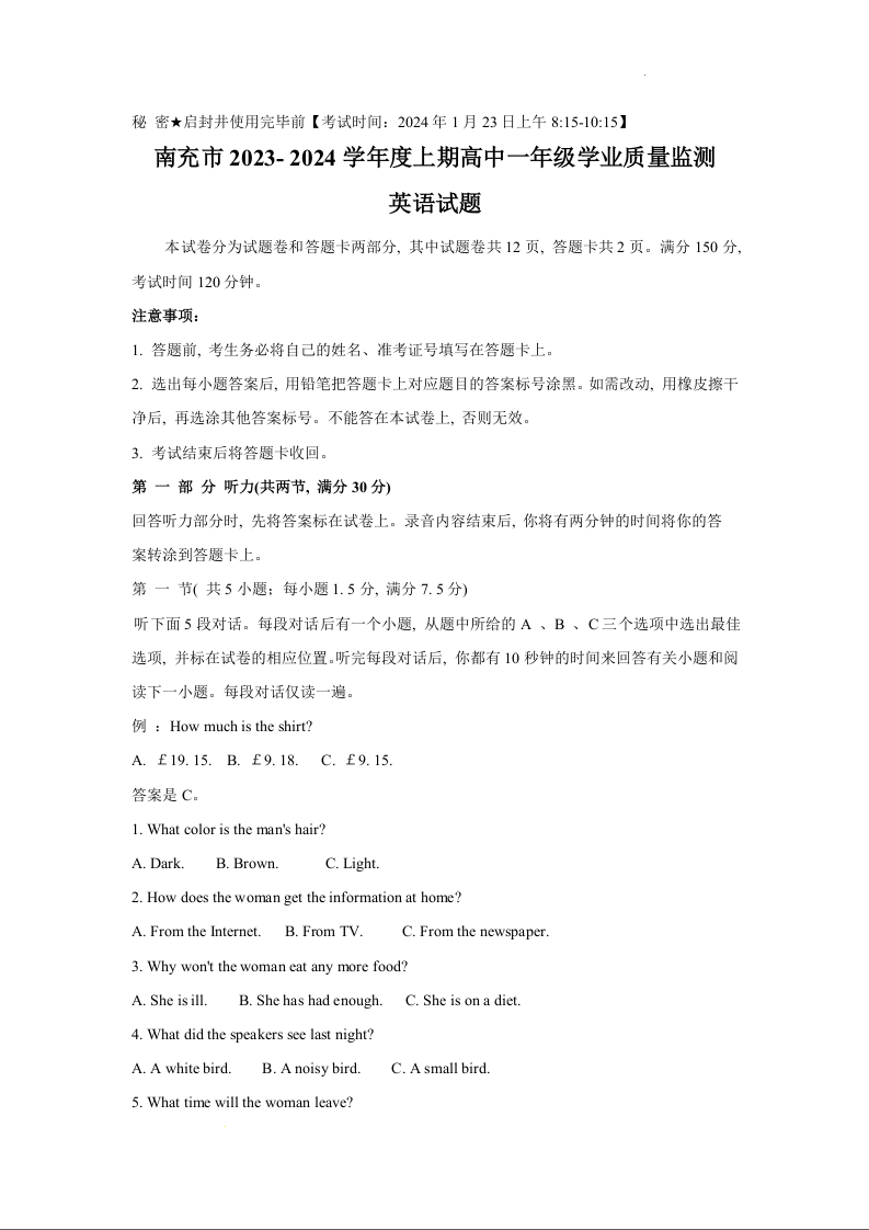 四川省南充市2023-2024学年高一上学期期末学业质量监测英语