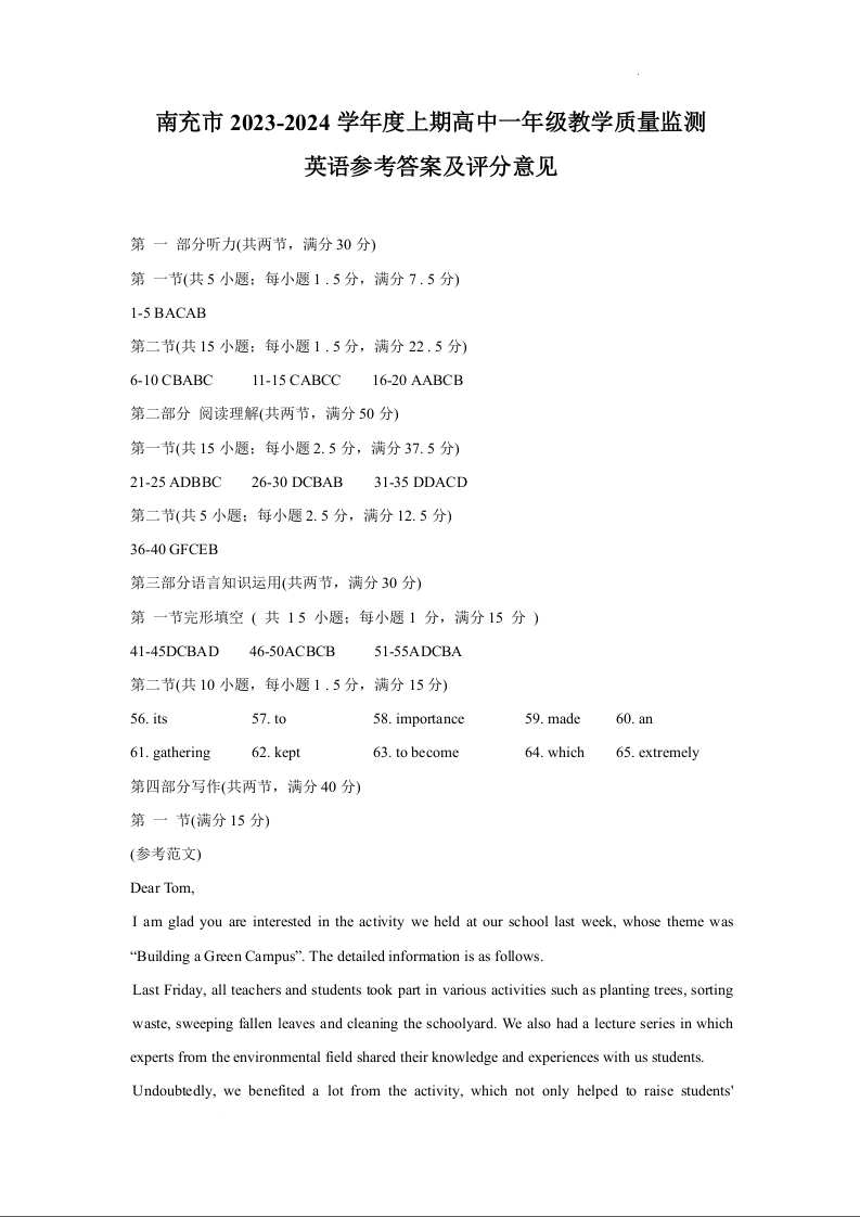 四川省南充市2023-2024学年高一上学期期末学业质量监测英语答案