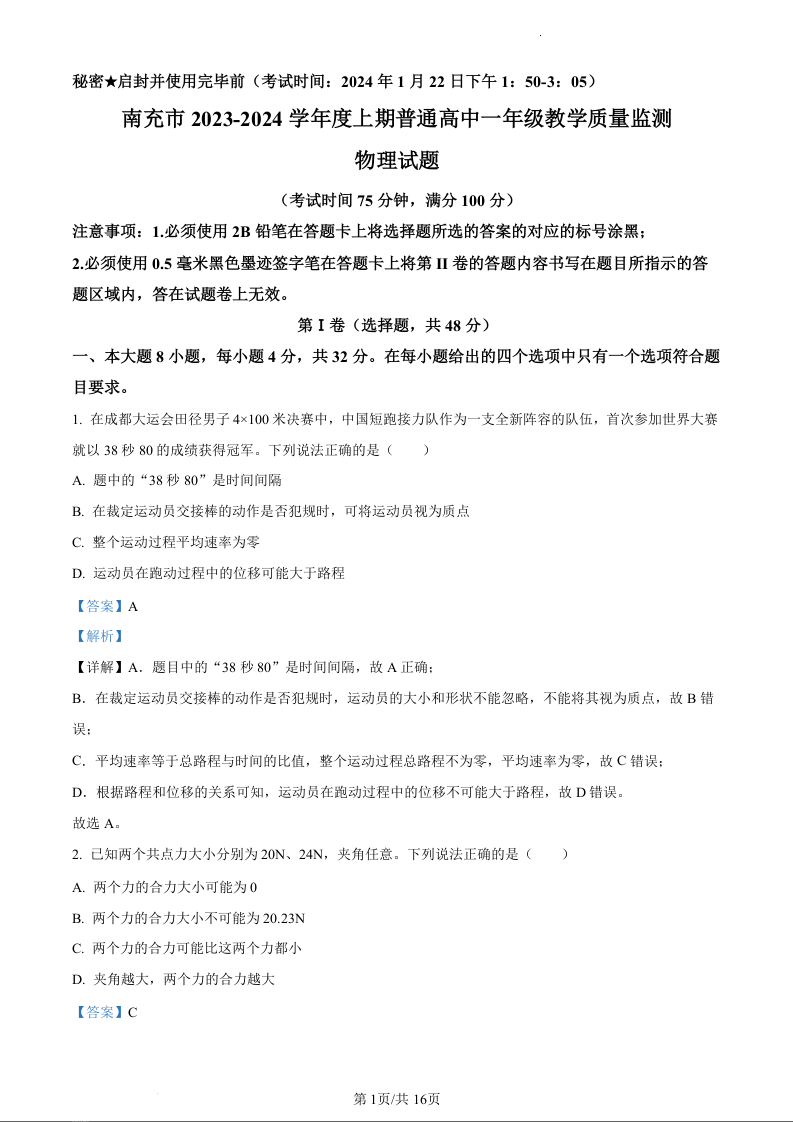 四川省南充市2023-2024学年高一上学期期末学业质量监测物理(精品解析版)