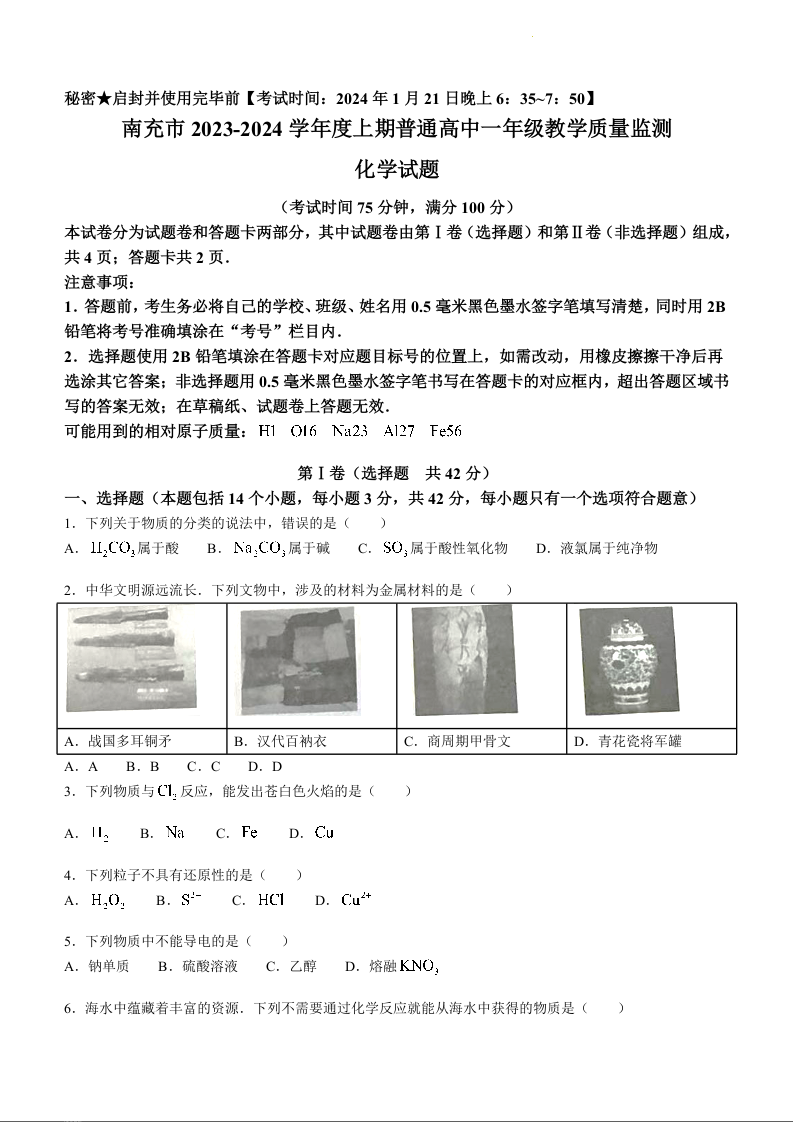 四川省南充市2023-2024学年高一上学期期末学业质量监测化学