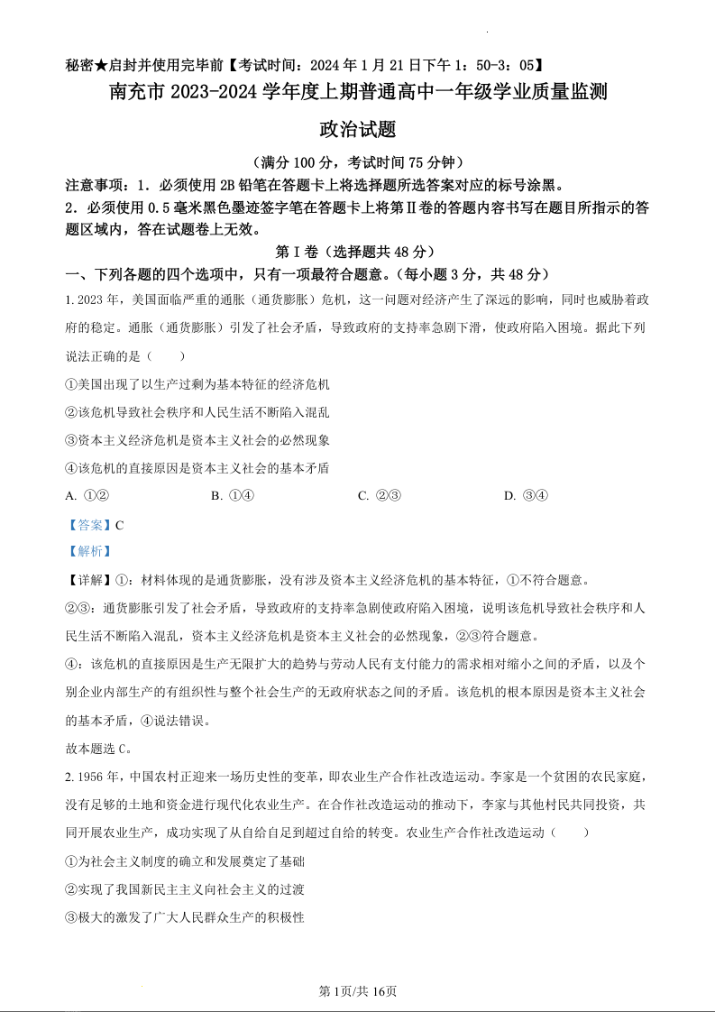 四川省南充市2023-2024学年高一上学期期末学业质量监测政治(精品解析版)