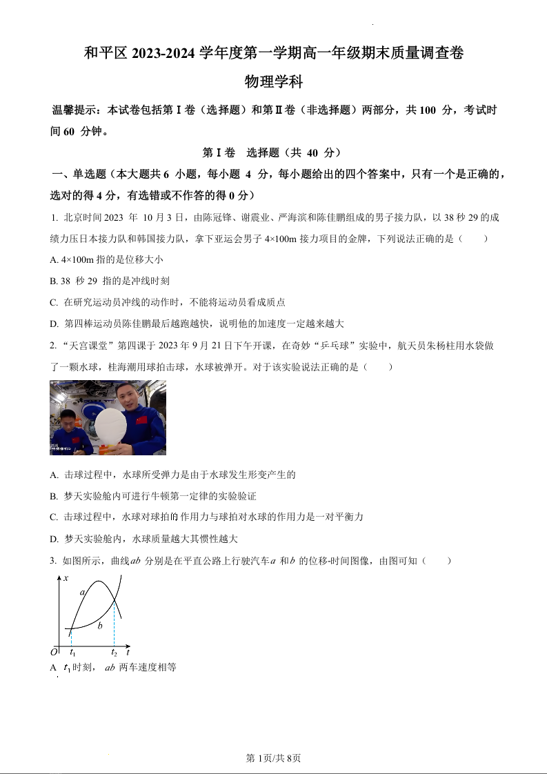 天津市和平区2023-2024学年高一上学期1月期末考试物理(原卷版)