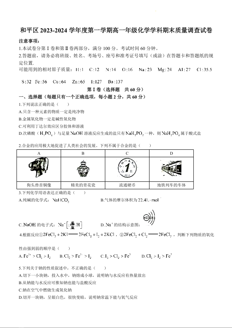 天津市和平区2023-2024学年高一上学期1月期末考试化学