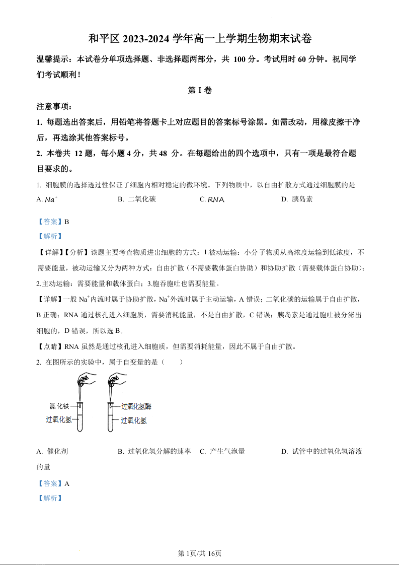 天津市和平区2023-2024学年高一上学期1月期末考试生物(精品解析版)