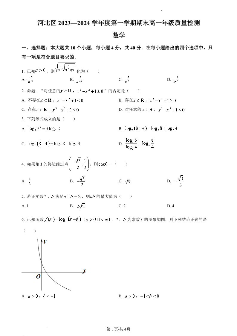 天津市河北区2023-2024学年高一上学期期末质量检测考试数学(原卷版)