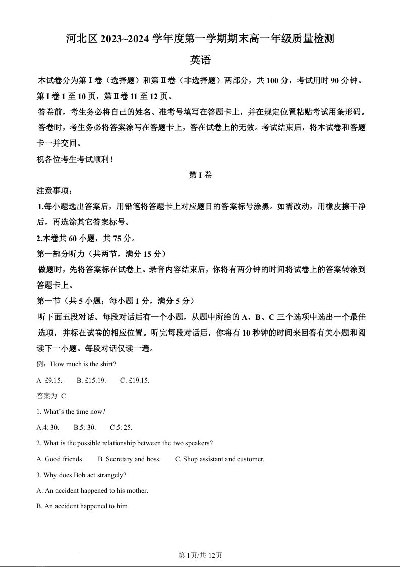 天津市河北区2023-2024学年高一上学期期末质量检测考试英语(原卷版)