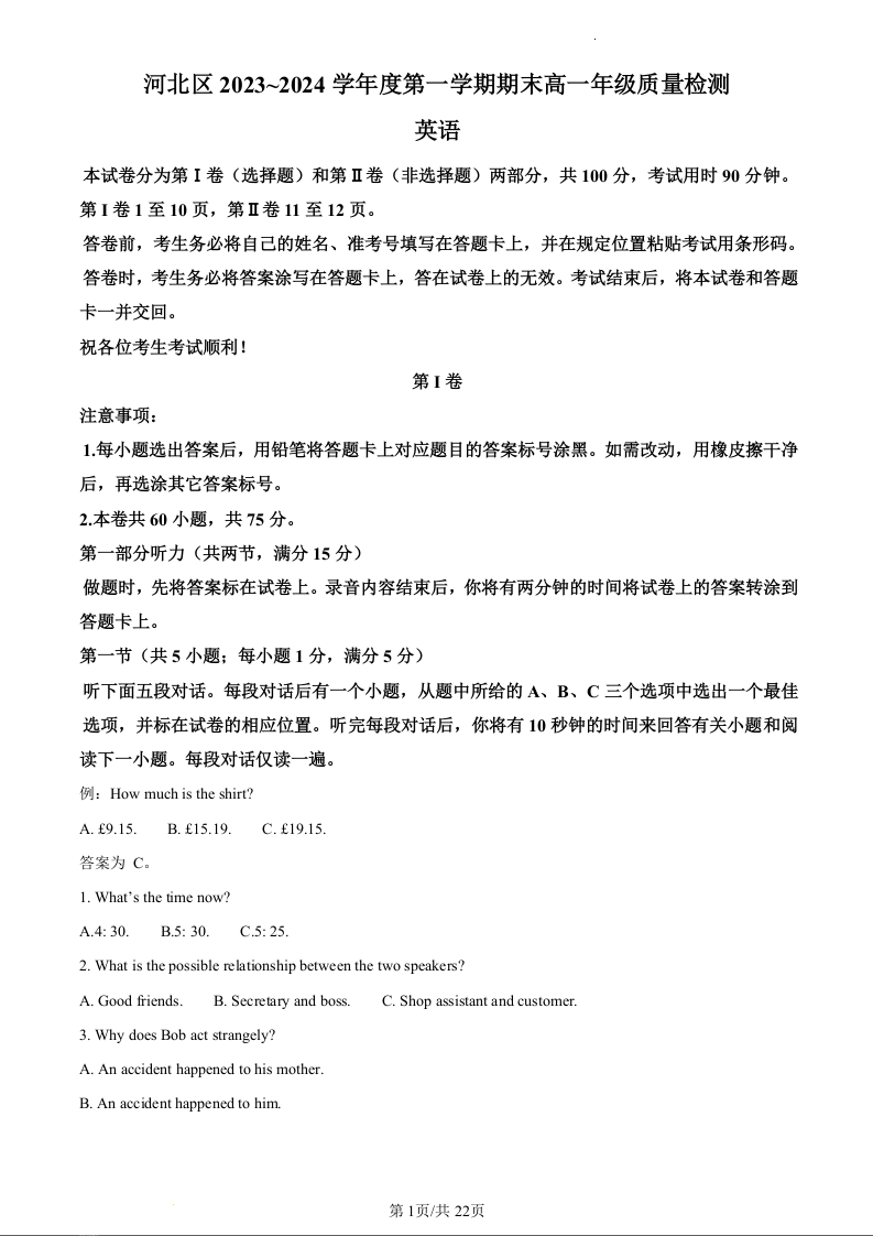 天津市河北区2023-2024学年高一上学期期末质量检测考试英语(精品解析版)