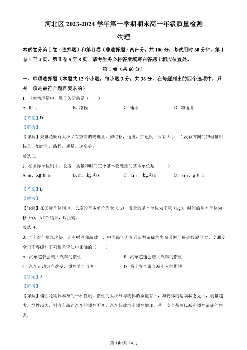 天津市河北区2023-2024学年高一上学期期末质量检测考试物理(精品解析版)