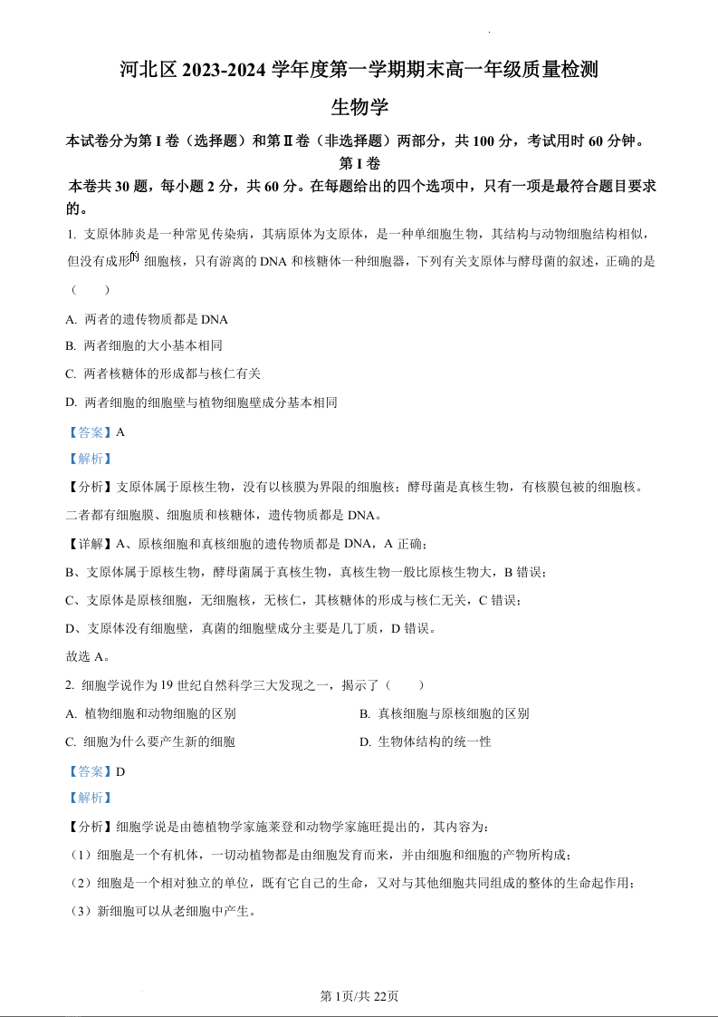 天津市河北区2023-2024学年高一上学期期末质量检测考试生物(精品解析版)
