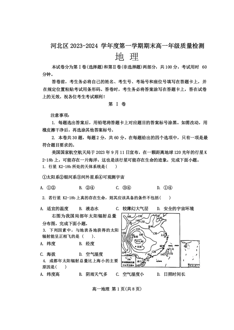 天津市河北区2023-2024学年高一上学期期末质量检测考试地理+答案