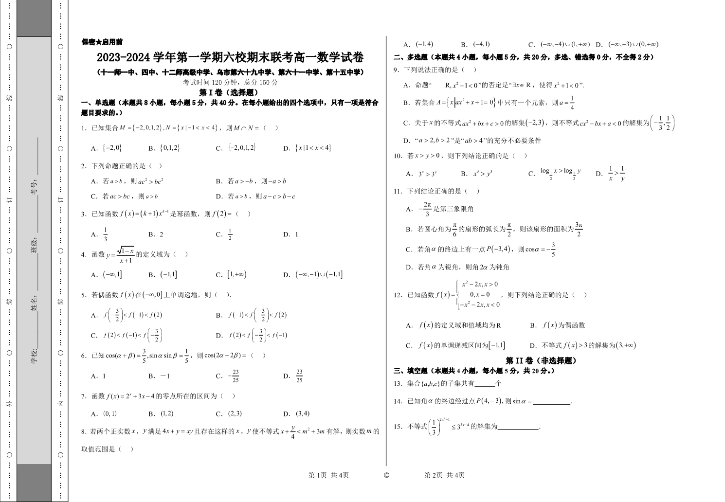 新疆维吾尔自治区乌鲁木齐市六校联考2023-2024学年高一上学期1月期末考试数学