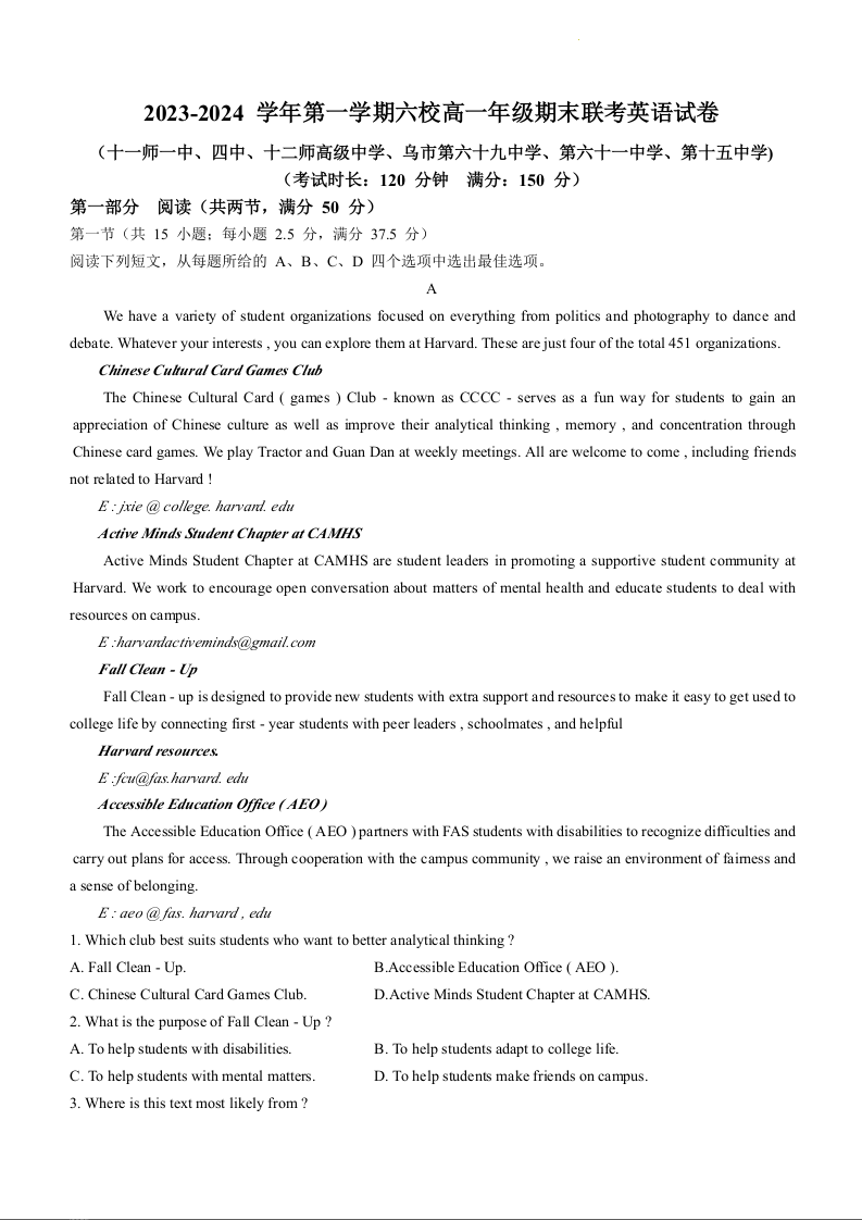 新疆维吾尔自治区乌鲁木齐市六校联考2023-2024学年高一上学期1月期末考试英语