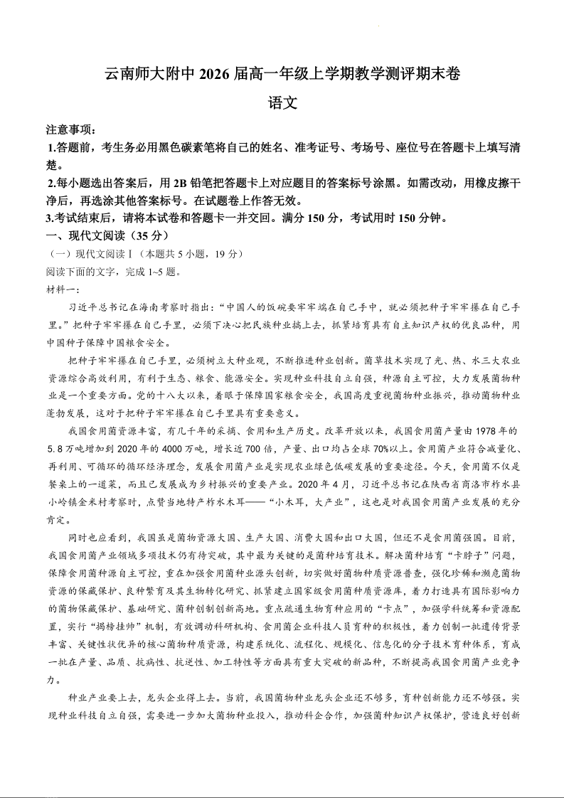 云南省昆明市云南师范大学附属中学2023-2024学年高一上学期1月期末考试语文+答案