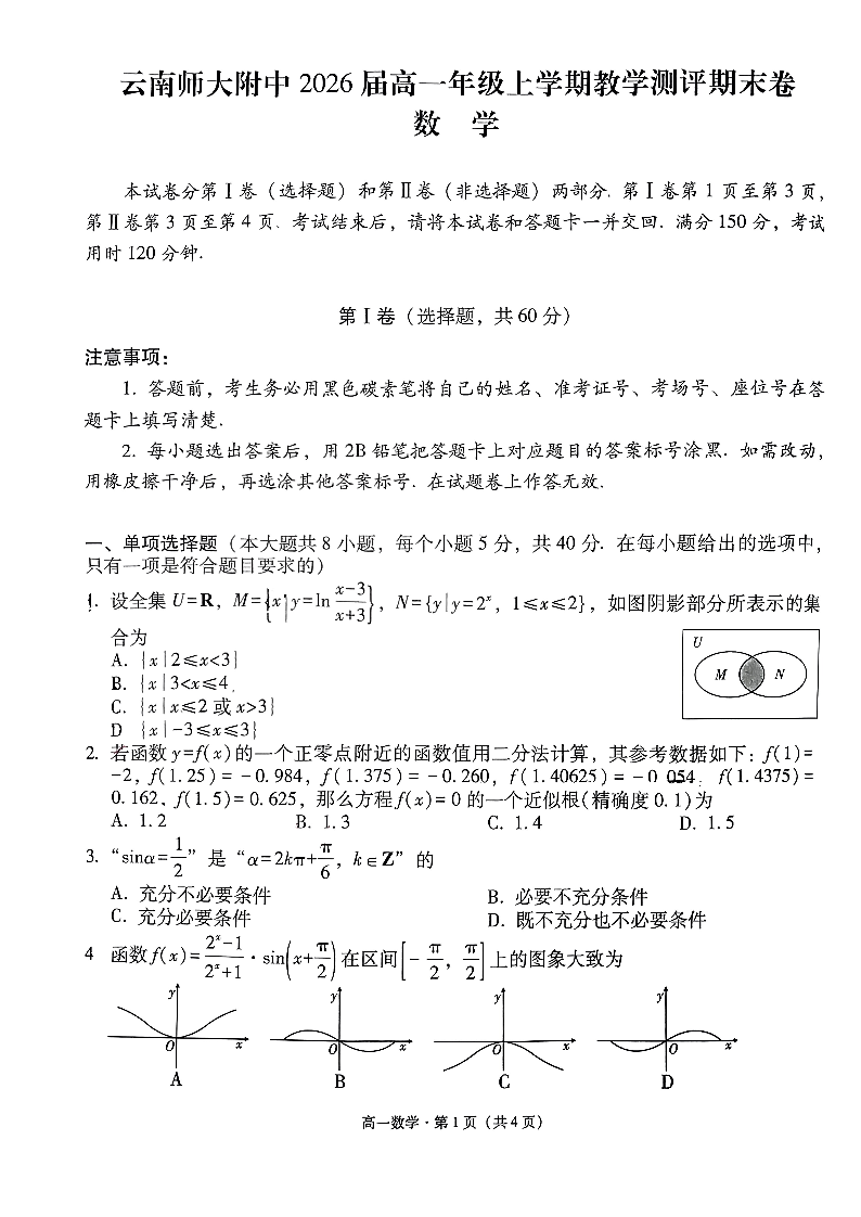 云南省昆明市云南师范大学附属中学2023-2024学年高一上学期1月期末考试数学