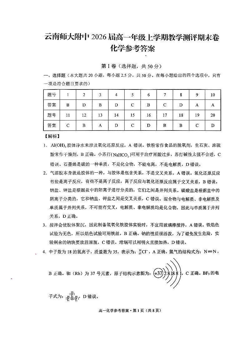 云南省昆明市云南师范大学附属中学2023-2024学年高一上学期1月期末考试化学答案