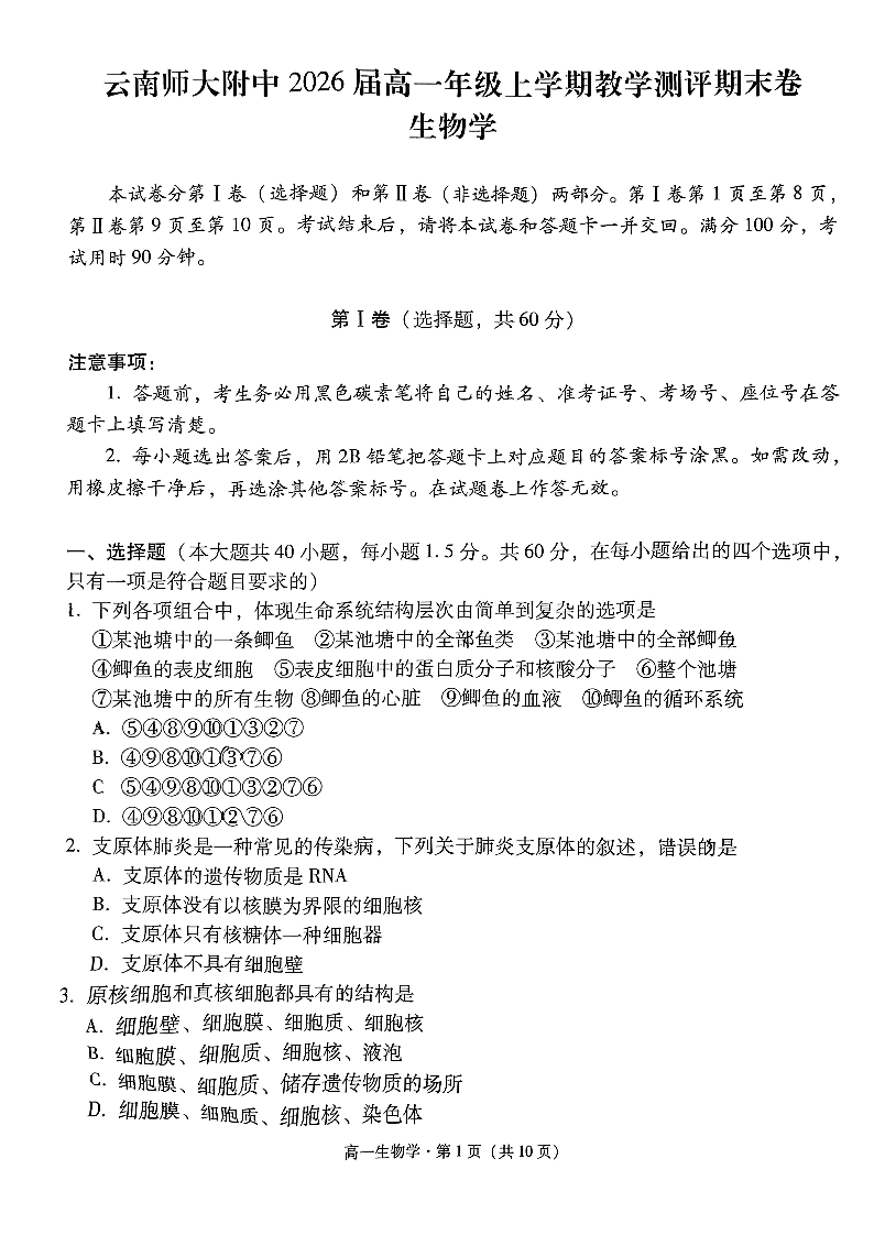 云南省昆明市云南师范大学附属中学2023-2024学年高一上学期1月期末考试生物