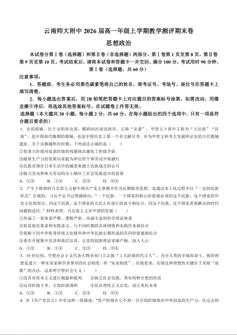 云南省昆明市云南师范大学附属中学2023-2024学年高一上学期1月期末考试政治
