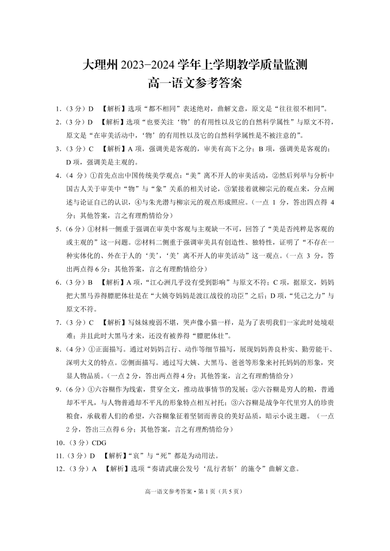 云南省大理白族自治州2023-2024学年高一上学期1月期末测试语文答案