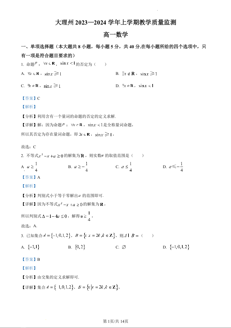 云南省大理白族自治州2023-2024学年高一上学期1月期末测试数学(精品解析版)