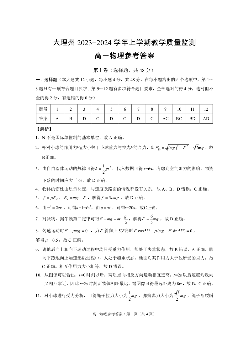 云南省大理白族自治州2023-2024学年高一上学期1月期末测试物理答案
