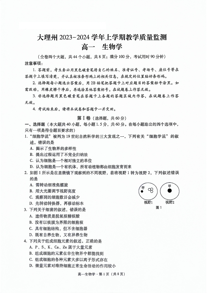 云南省大理白族自治州2023-2024学年高一上学期1月期末测试生物
