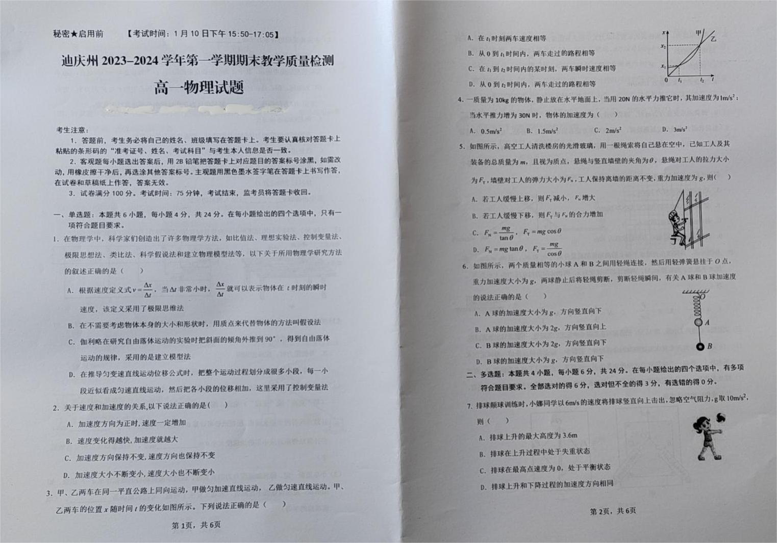 云南省迪庆州2023-2024学年高一上学期期末考试物理