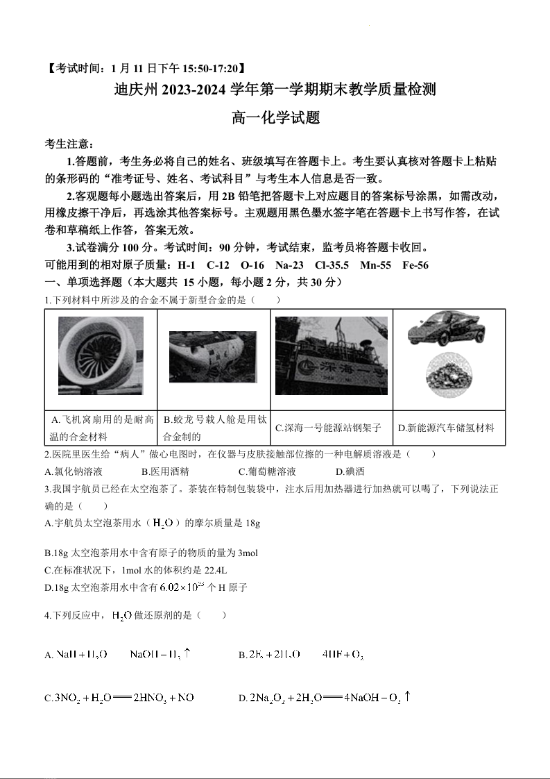 云南省迪庆州2023-2024学年高一上学期期末考试化学