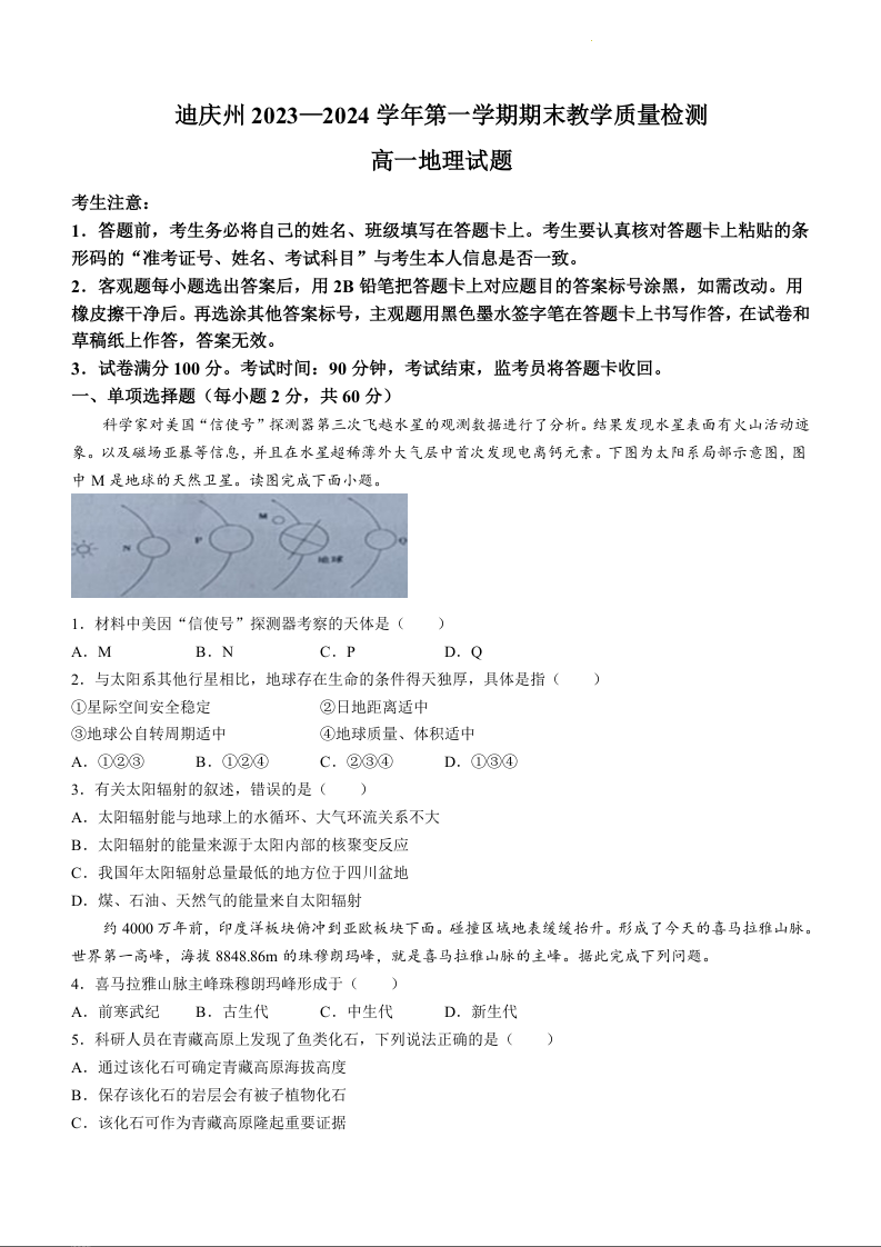 云南省迪庆州2023-2024学年高一上学期期末考试地理