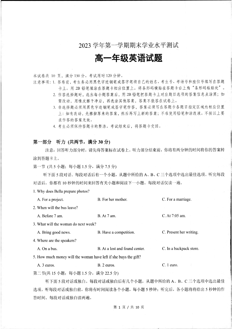 浙江省杭州市2023学年第一学期期末学业水平测试英语