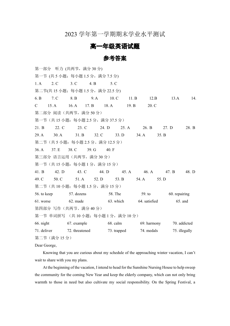 浙江省杭州市2023学年第一学期期末学业水平测试英语答案