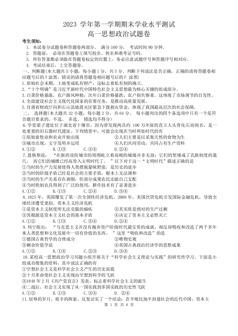浙江省杭州市2023学年第一学期期末学业水平测试政治