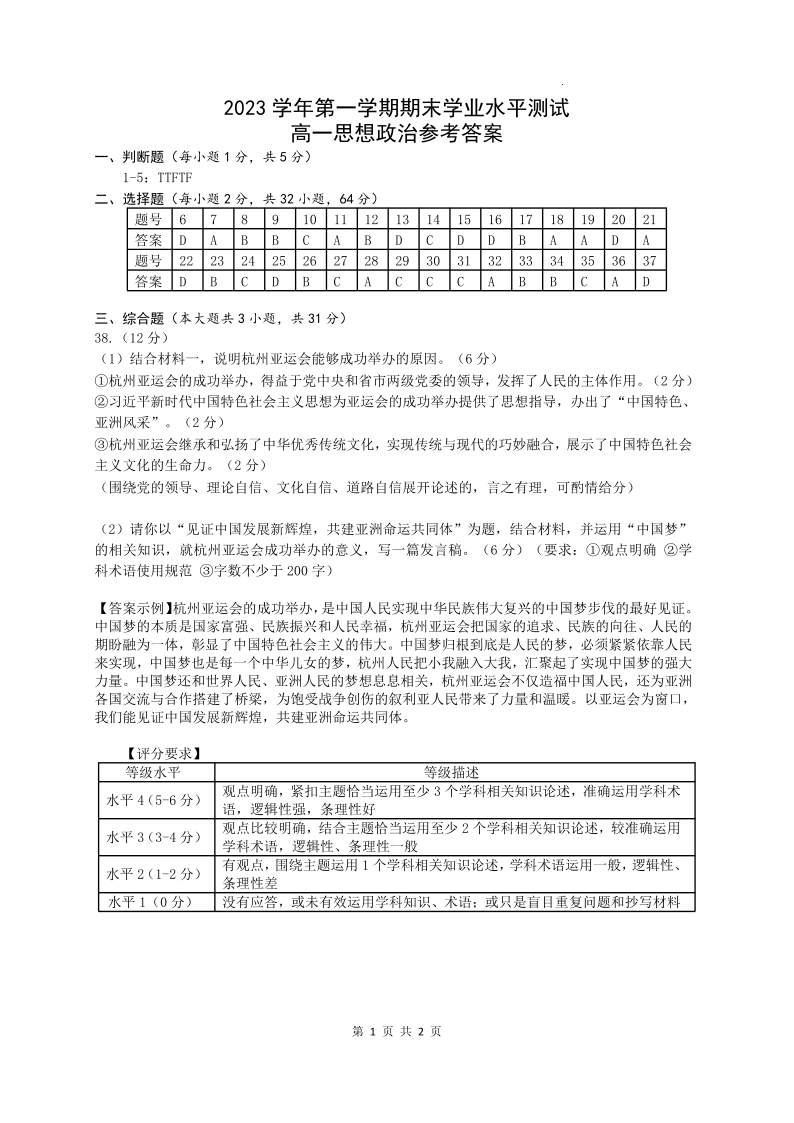 浙江省杭州市2023学年第一学期期末学业水平测试政治答案