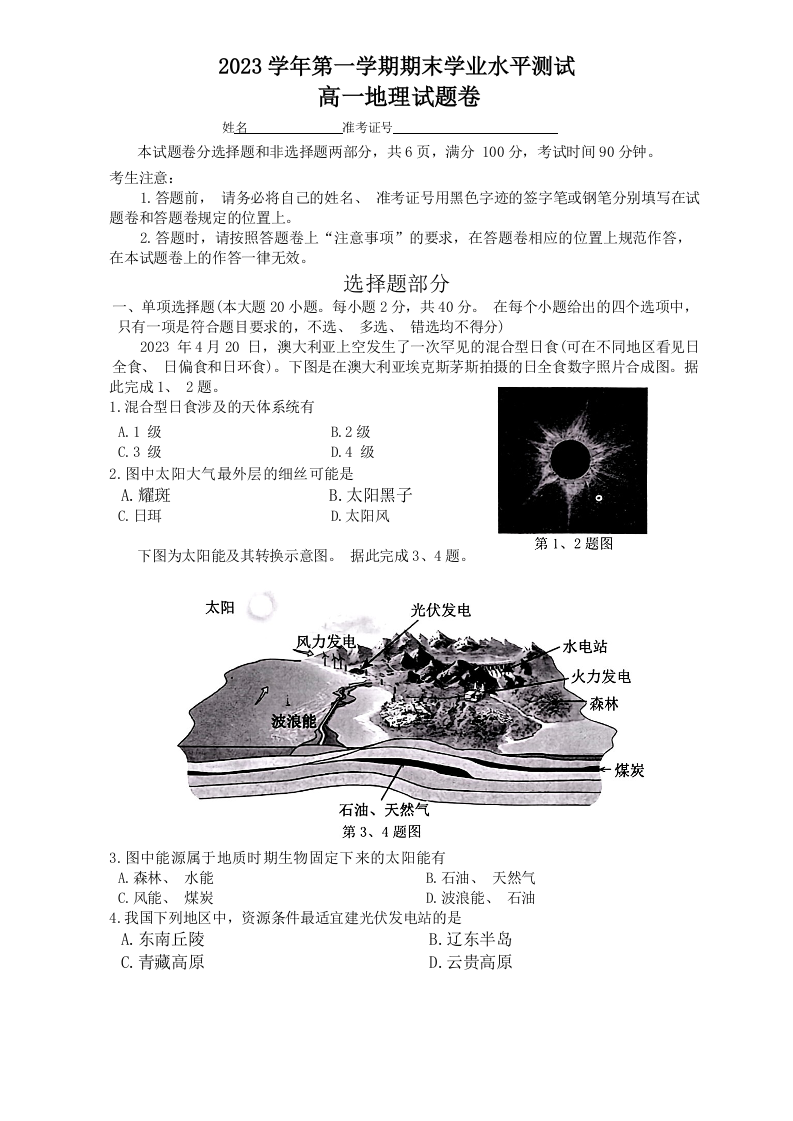 浙江省杭州市2023学年第一学期期末学业水平测试地理