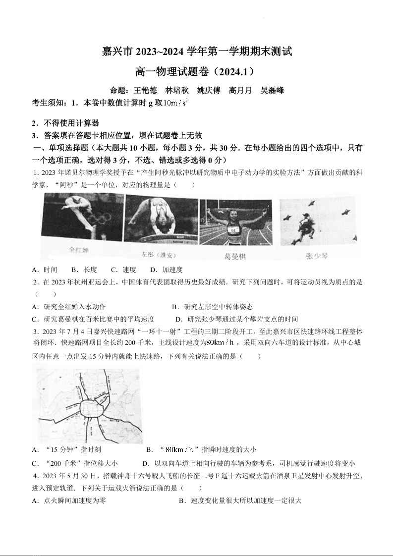 浙江省嘉兴市2023~2024学年第一学期期末测试物理+答案