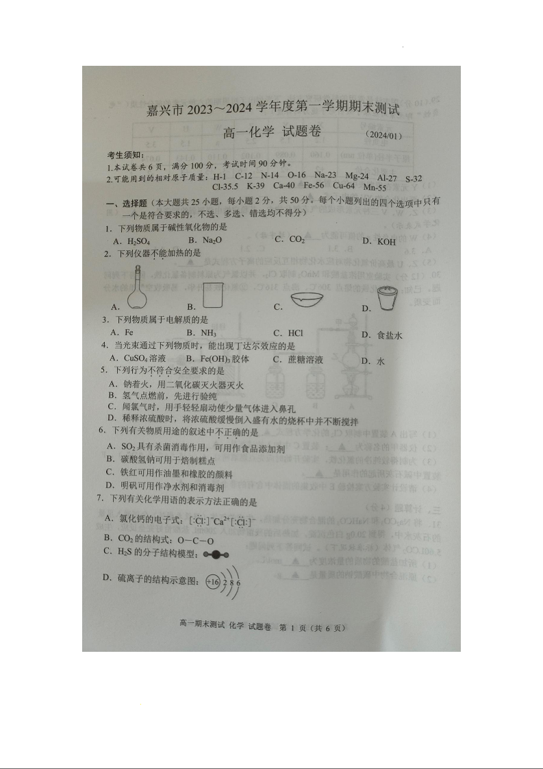 浙江省嘉兴市2023~2024学年第一学期期末测试化学