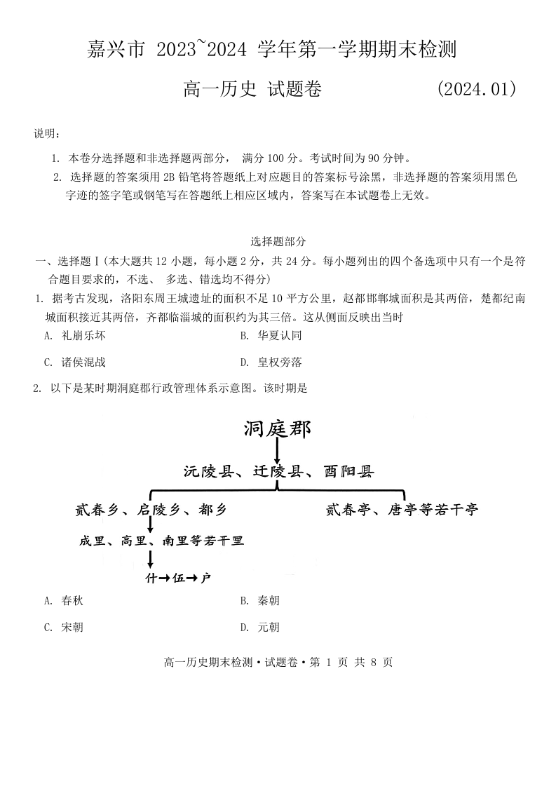 浙江省嘉兴市2023~2024学年第一学期期末测试历史
