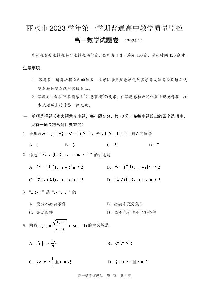 浙江省丽水市2023学年第一学期普通高中教学质量监控数学