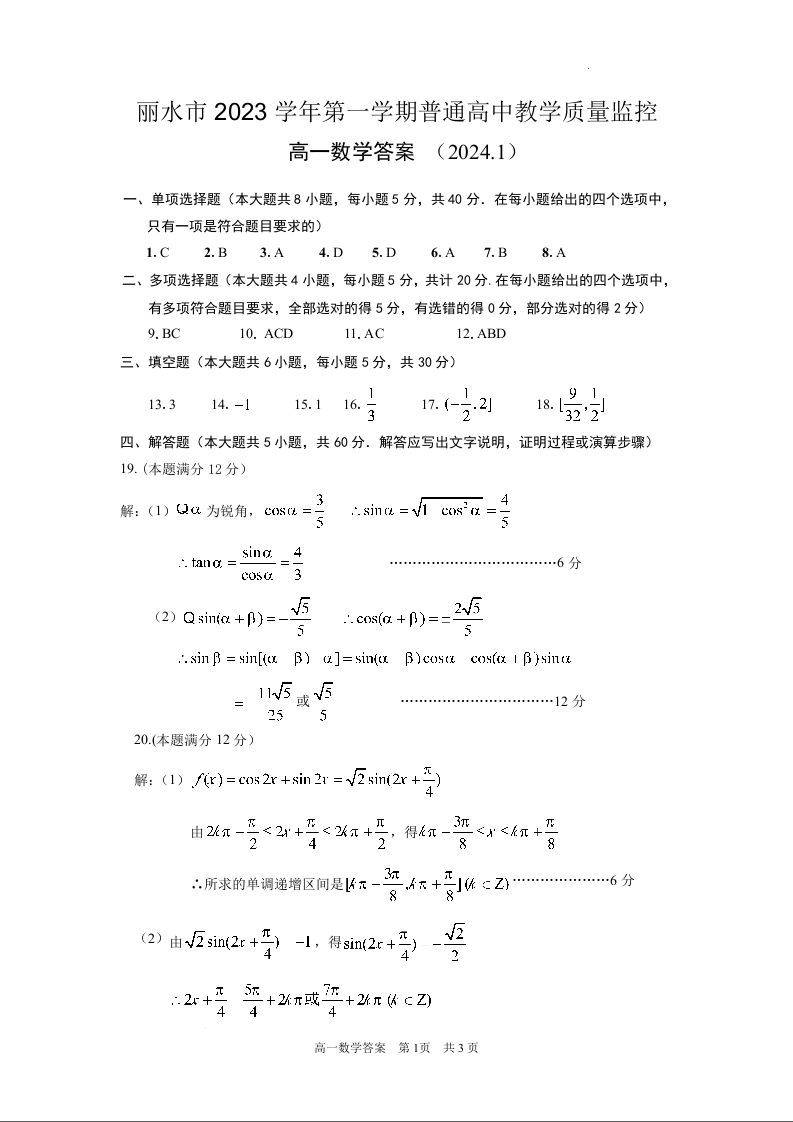 浙江省丽水市2023学年第一学期普通高中教学质量监控数学答案