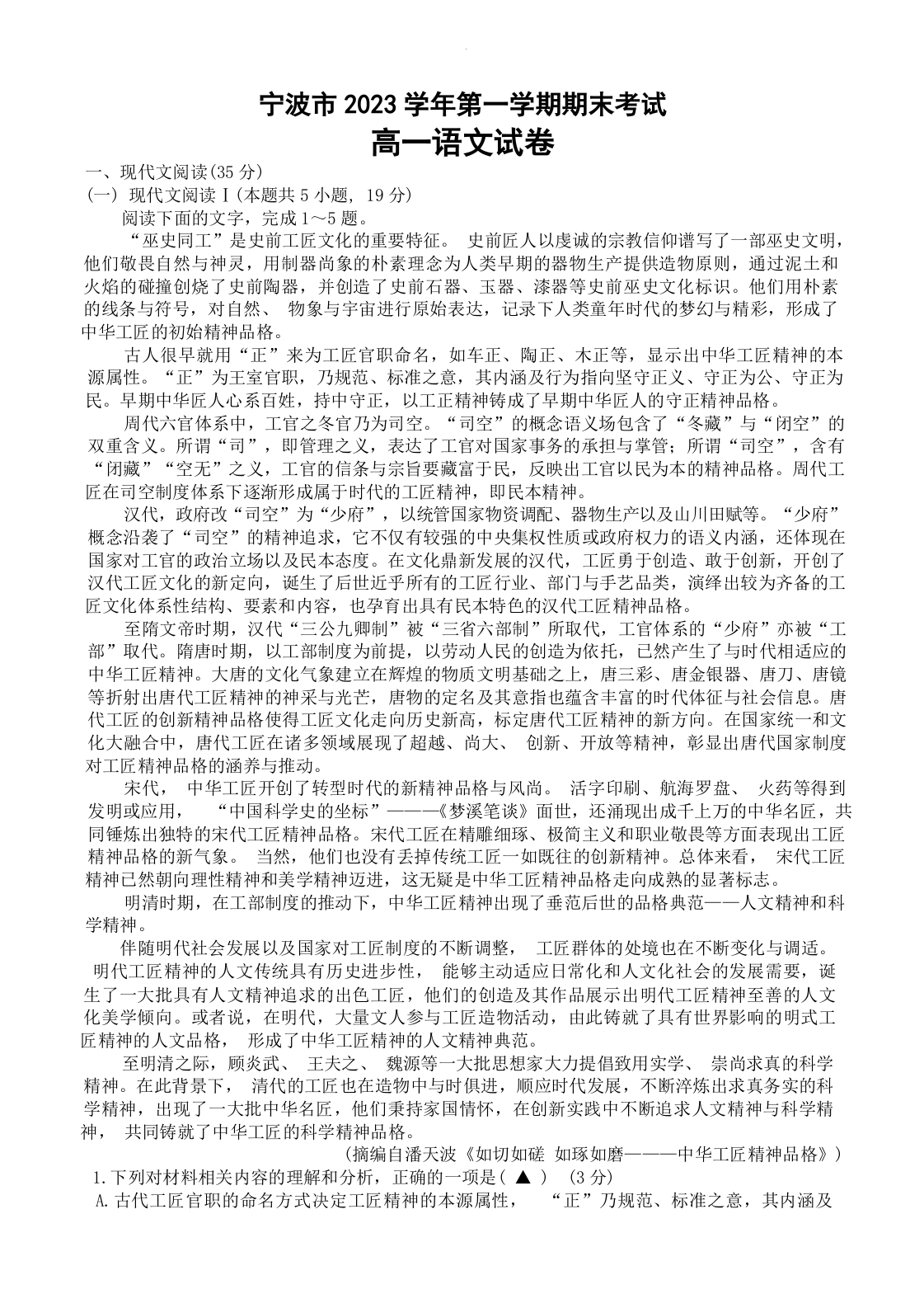 浙江省宁波市 2023 学年第一学期期末考试语文