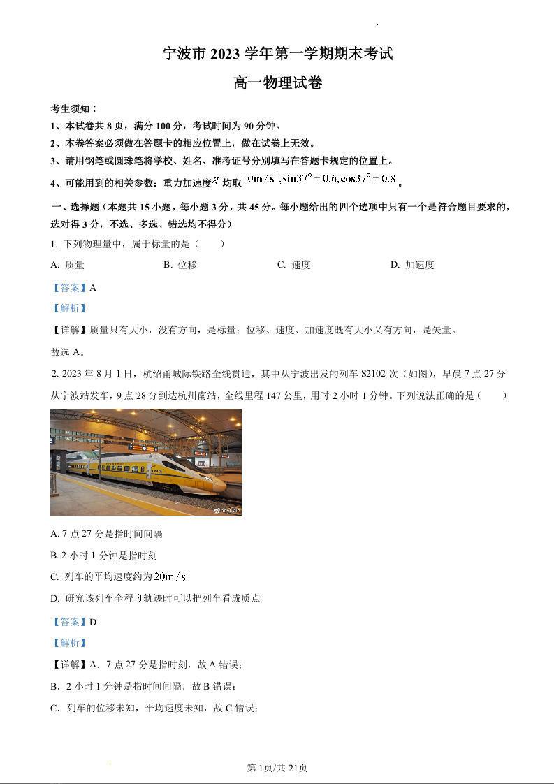 浙江省宁波市 2023 学年第一学期期末考试物理(精品解析版)