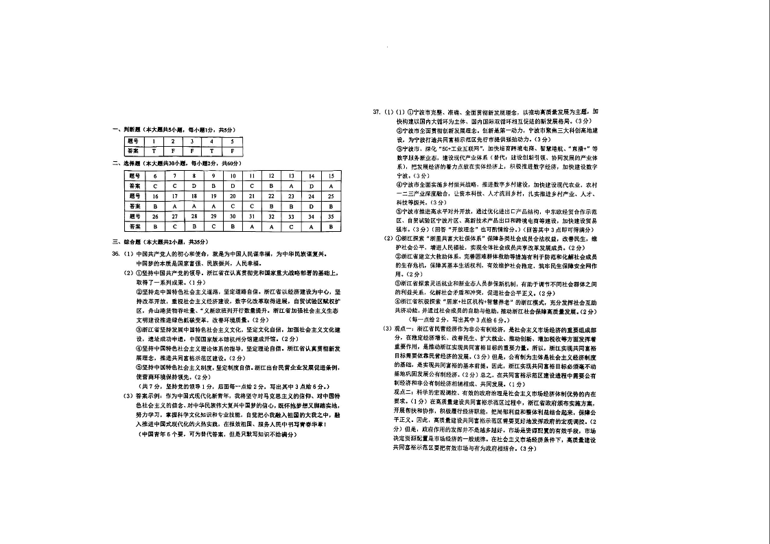 浙江省宁波市 2023 学年第一学期期末考试政治答案