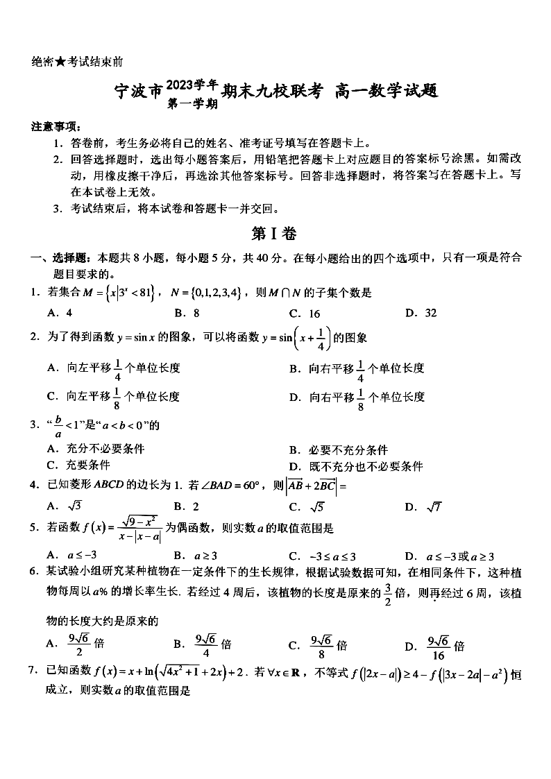 浙江省宁波市2023学年第一学期期末九校联考数学+答案