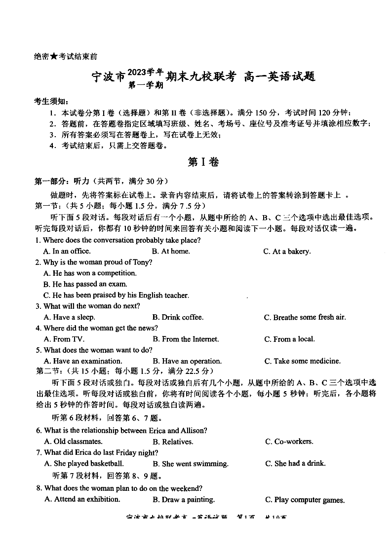 浙江省宁波市2023学年第一学期期末九校联考英语+答案