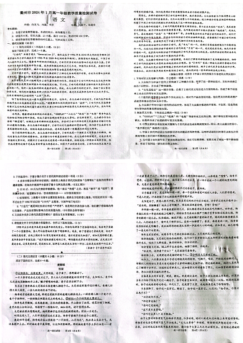 浙江省衢州市 2024年1月高一年级教学质量检测语文