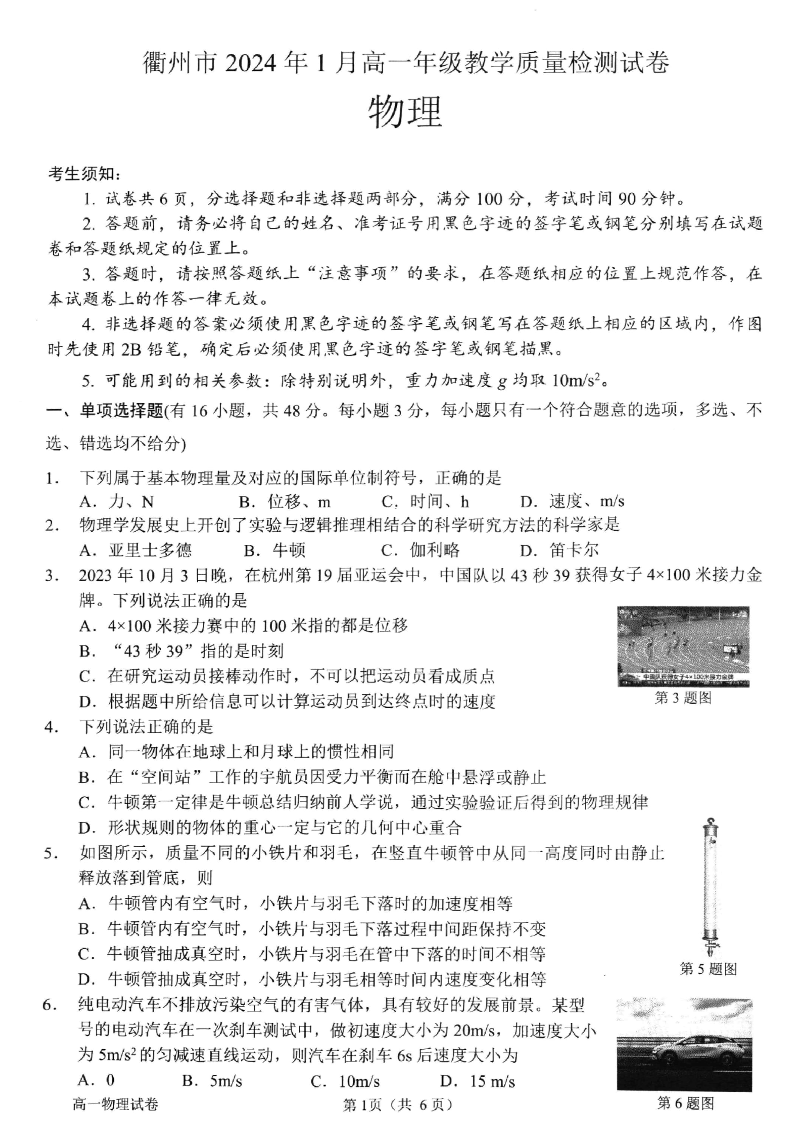 浙江省衢州市 2024年1月高一年级教学质量检测物理+答案
