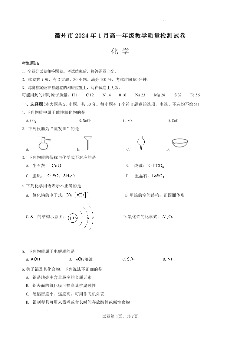 浙江省衢州市 2024年1月高一年级教学质量检测化学
