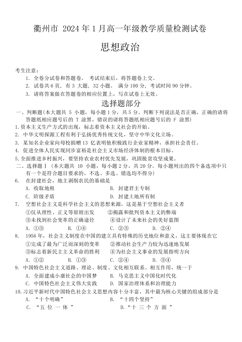 浙江省衢州市 2024年1月高一年级教学质量检测政治