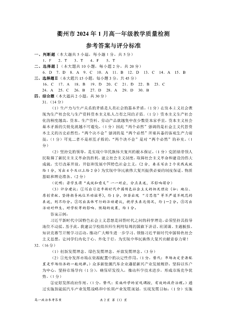 浙江省衢州市 2024年1月高一年级教学质量检测政治答案