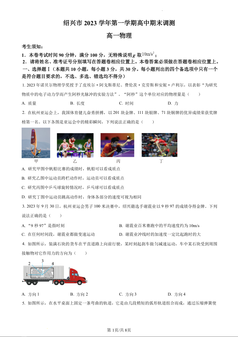 浙江省绍兴市2023学年第一学期高中期末调测物理(原卷版)